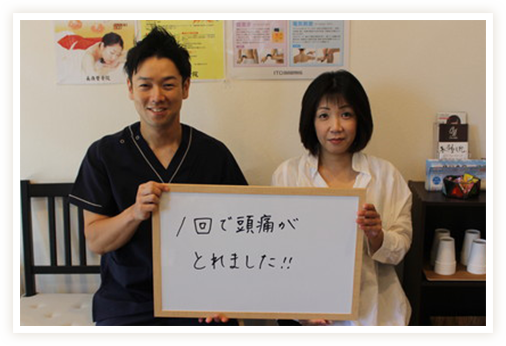 - 1回目から施術の効果を感じた。今では肩こりが気にならなくなった。頭痛の回数も減り生活が楽になった。